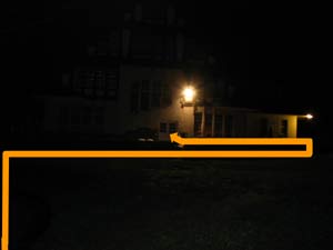 - Unmittelbar nach dem kleinen Wendekreis steht das Jugendstilgebäude Kurmittelhaus I. Dort etwas rechts siehst Du auch die Eingangstür. Rechts herum, an der Tür vorbei,