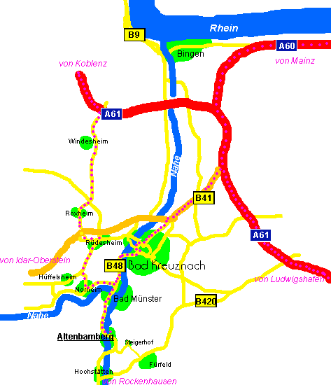 - Erst den Schildern Richtung Bad Kreuznach, dann Richtung Bad Münster folgen. (Wegen diverser neuer Kreisel, die sich fast täglich vermehren, traue ich mir eine