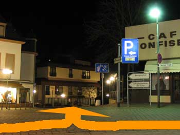 - Über den Zebrastreifen vor der Apotheke und in die sich anschließende verkehrsberuhigte Zone (Goetheplatz) gehen. (siehe Bild 1 unten)